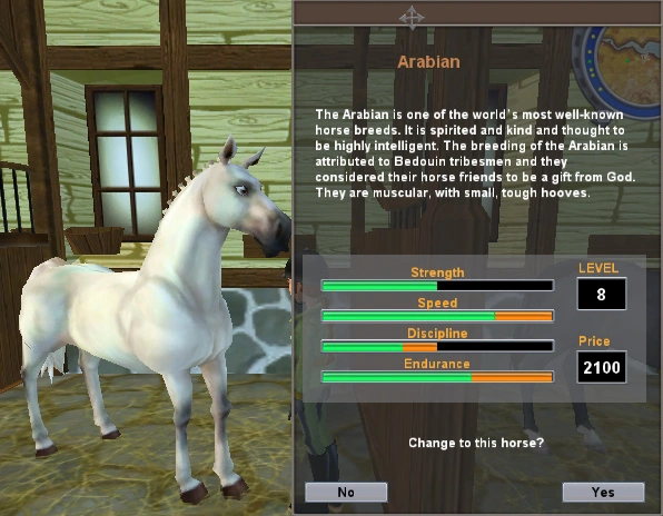 "The Arabian is one of the world's most well-known horse breeds. It is spirited and kind and thought to be highly intelligent. The breeding of the Arabian is attributed to Bedouin tribesman and they considered their horse friends to be a gift from god. They are muscular, with small, tough hooves. - Star Stable: The Winter Rider