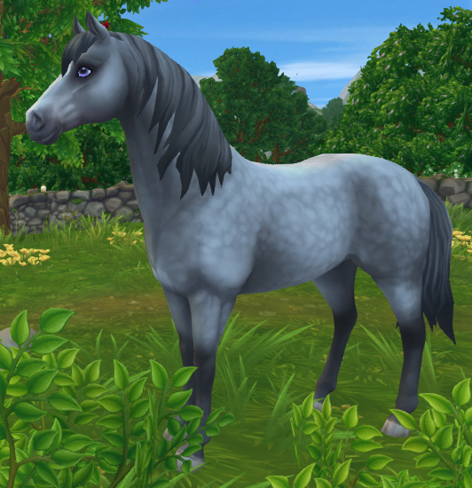 She is a dapple grey Jorvik Warmblood, with a dark grey mane, lilac eyes, and a unique upside-down teardrop shaped symbol on her forehead.