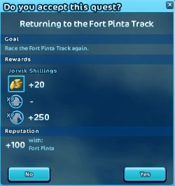 "You're here to train on the Fort Pinta Scenic Circuit? Um... Well, James says I'm only supposed to let people with the Fort Pinta Annual Party Pass use the track. Can I interest you in buying a pass? Er... Never mind. Just go ahead and use the track. If James asks, tell him you're an influencer. He'll let anyone use his track if they have enough followers." New Quote - Sindra