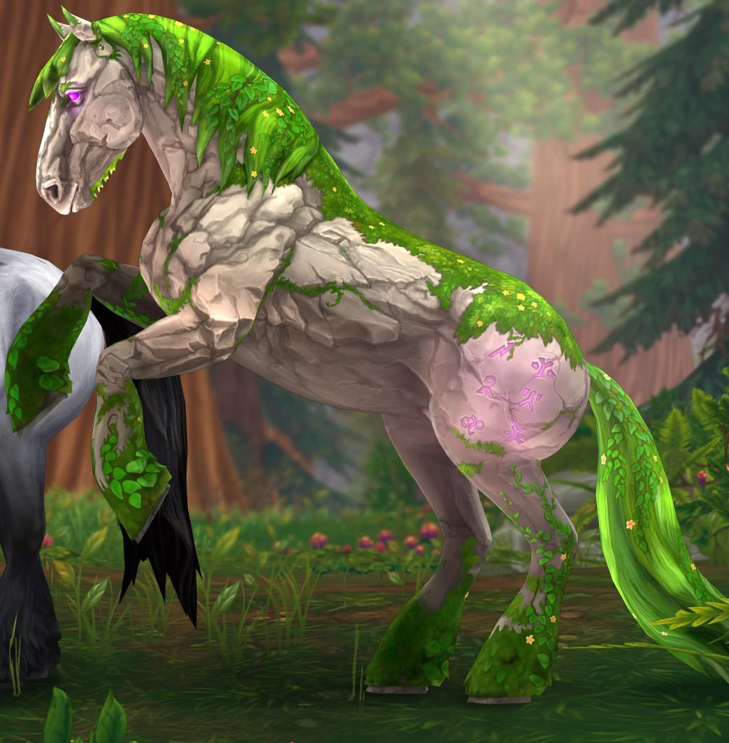 - Natural color: Tan Stone-like body with mossy mane, tail and feathers, and glowing runes on the flank.