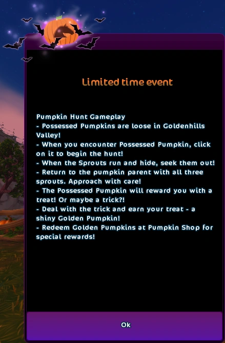 The mechanics of the hunt are explained in the introduction quest. The player has to seek out a Possessed Pumpkin on one of the five spawn places and interact with it by clicking on it. Upon interaction, the three Sprouts around the pumpkin run off in different directions and a circle of mist forms, setting a boundary of the area where to seek them. They usually hide behind terrain obstacles, such as rocks, fences, trees or bushes, and when the player finds and interacts with a sprout, it will start following them. Once the player collects all three Sprouts, they can approach the Possessed Pumpkin and interact with it. Upon interaction, one of the three following scenarios happens: