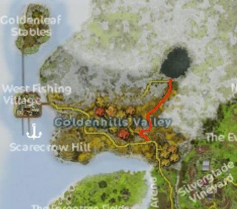 Shadowhill Road is a trail that runs off the eastern end of The Golden Road, running through the Shadowy Hills and ending near the entrance to Witch Pi's home.