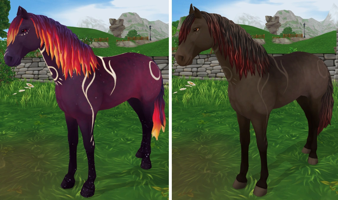 The Umbra is a magical horse with the special ability to change colors. When the player presses the "h" key or the magic horse icon on the horse's character sheet, the horse will change from its neutral colors to its natural (magic) colors and vice versa. The horse will not change colors during races or while the player is unmounted.
